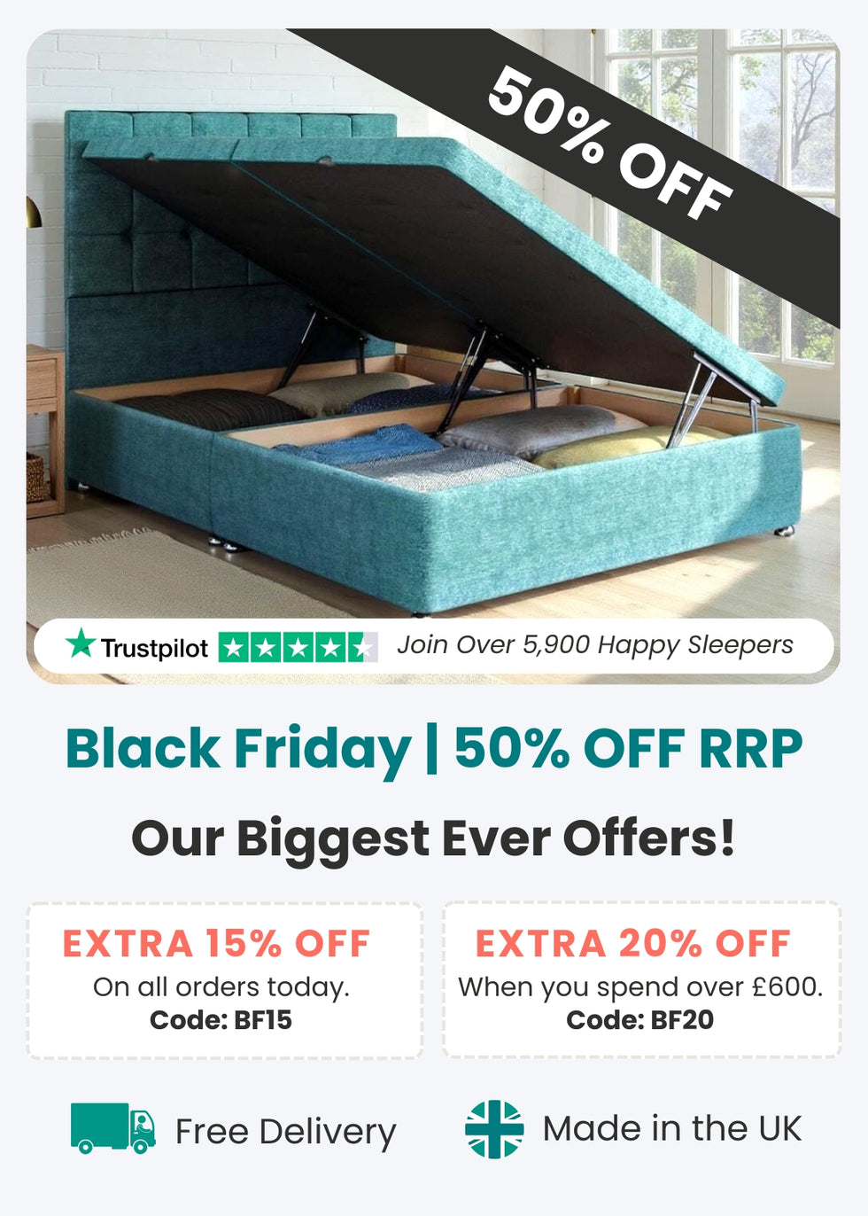 Our customers trust us to deliver comfort, quality, and care. Rated “Excellent” on Trustpilot, with over 5,900 happy sleepers, our customers praise the long-lasting quality of our divan beds, the professionalism of our delivery team, and the life-changing difference better sleep has made.